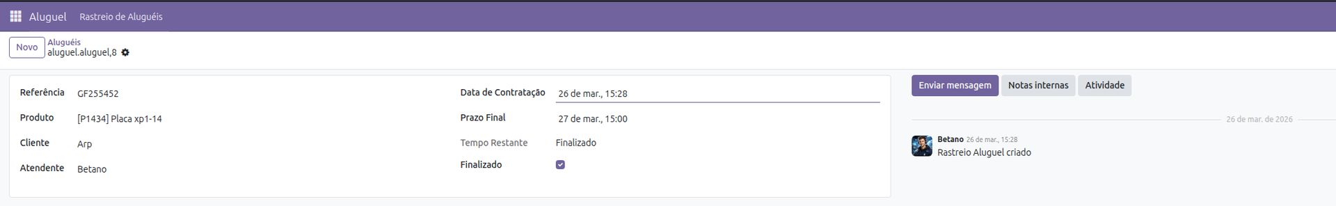 O módulo de aluguel foi desenvolvido para gerenciar o ciclo completo de locações dentro do Odoo, desde o registro inicial até o acompanhamento de prazos e visualização pelo cliente.