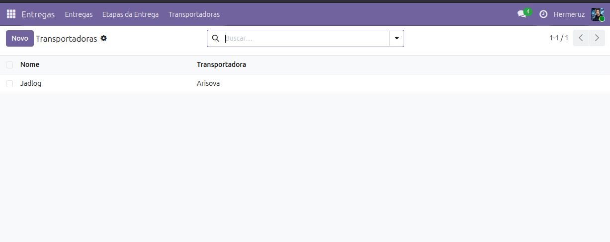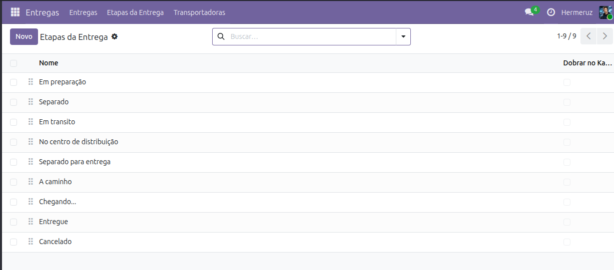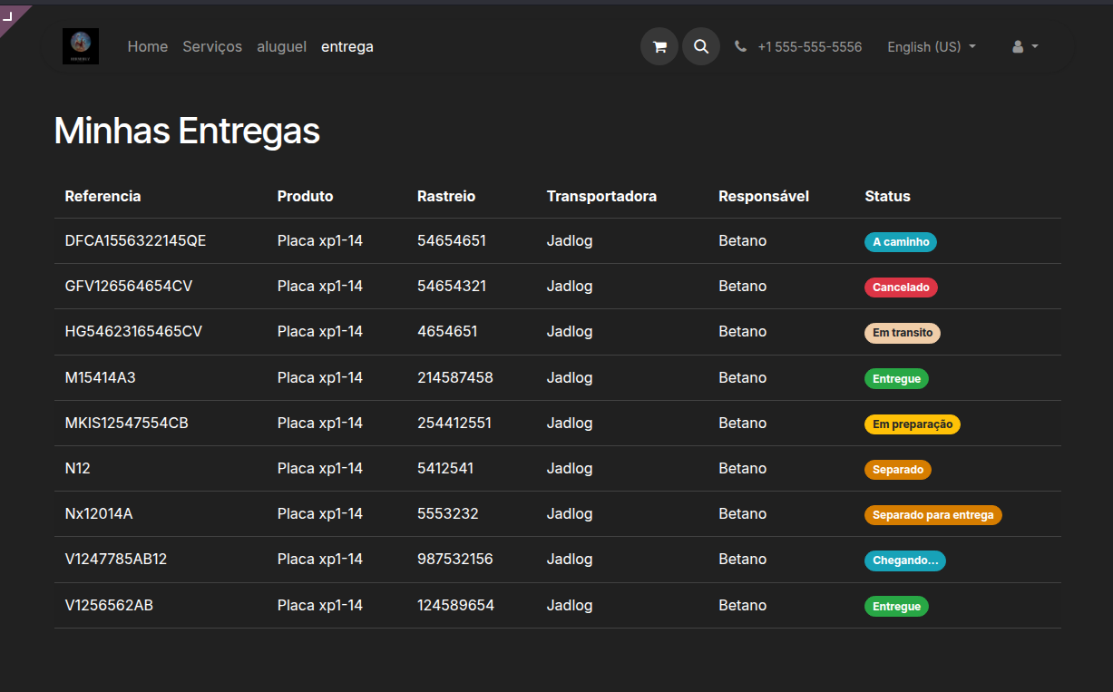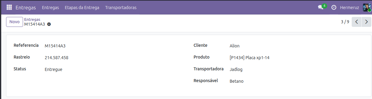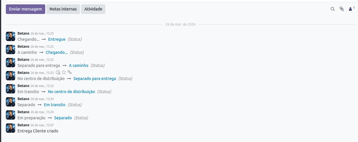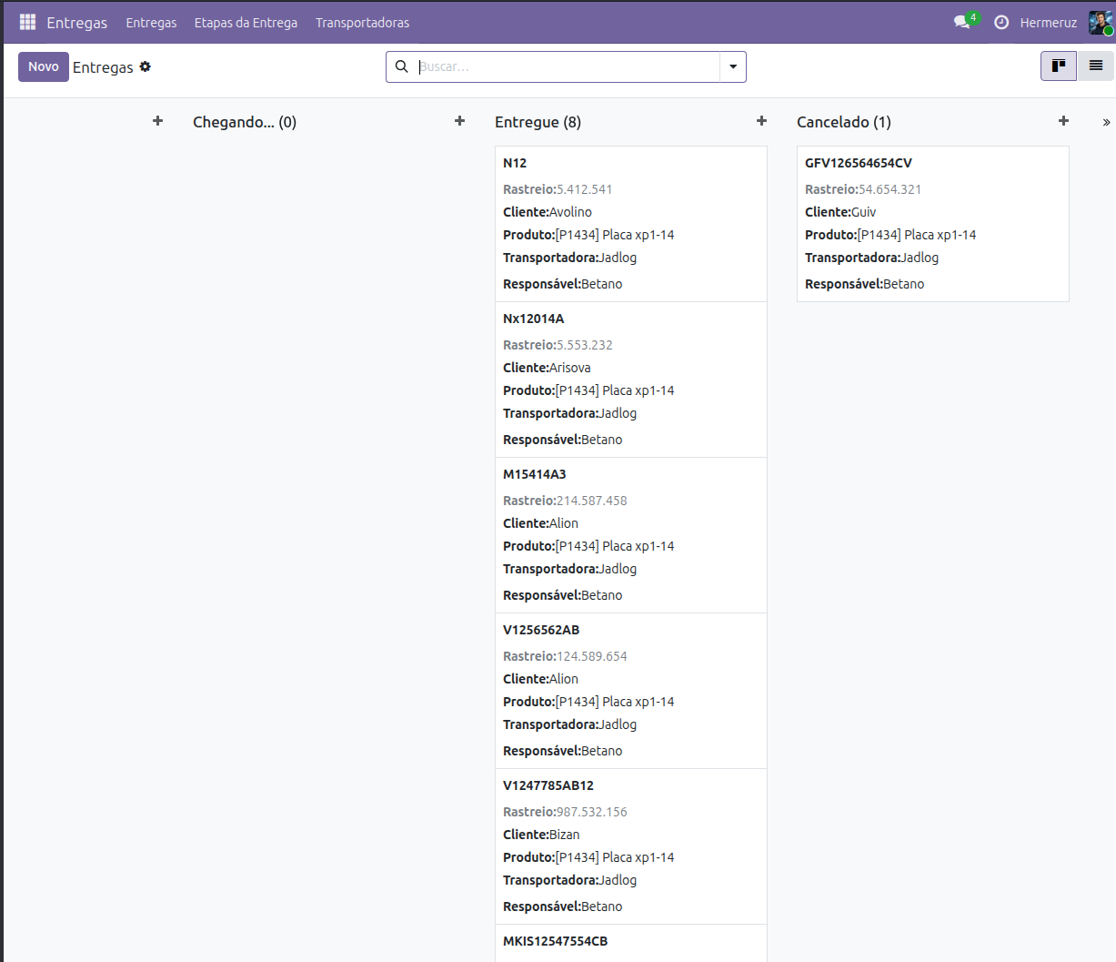 No ambiente interno do Odoo, é possível visualizar todas as entregas com seus respectivos dados: